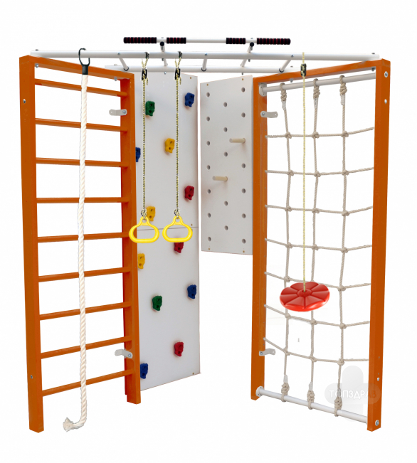 Модель Kampfer Fantastic включает в себя самый обширный набор аксессуаров - турник, шведскую стенку, канатный лаз, скалодром, пегборд, и самые популярное навесное оборудование канат, кольца и лиану. Крепкий металлический турник выдерживает нагрузку до 120 кг, подходит как детям так и взрослым. Навесное оборудование Kampfer на прочных тросах выдерживает нагрузку до 100 кг. Допустимая нагрузка на скалолаз, пегборд, канатный лаз и навесное оборудование 50 кг. Особенностью пристенной шведской стенки Kampfer Fantastic является угловая конструкция, большой двойной скалолаз имеющий 12 пластиковых зацепов. Малышам очень нравится - лазить по скалолазу, забираться вверх по сетке канатного лаза, перебираться по пегборду, висеть на канате и качаться на лиане.